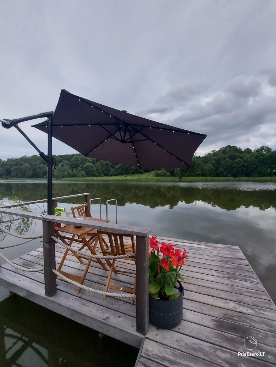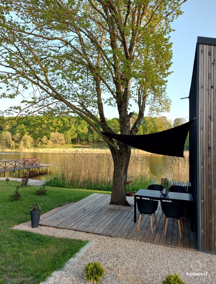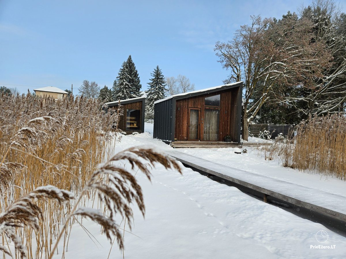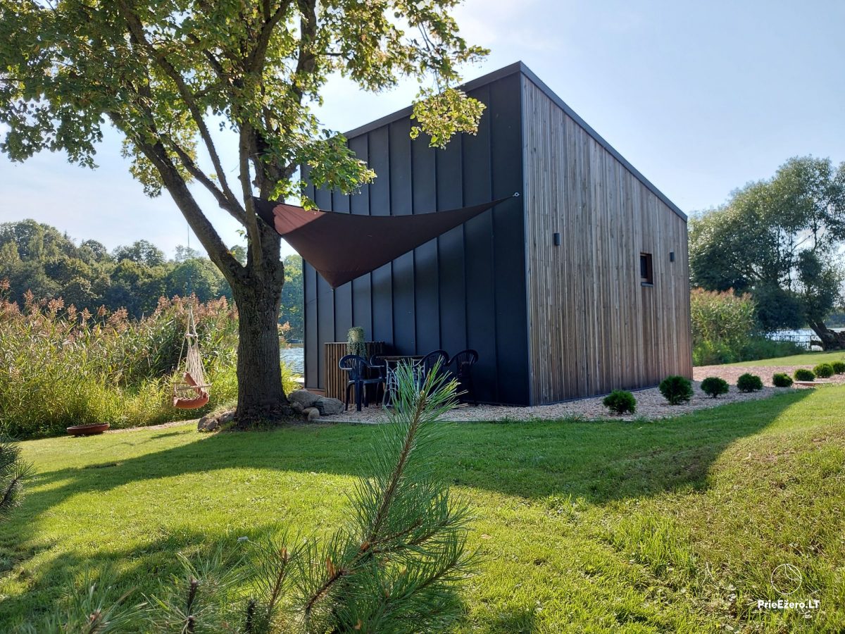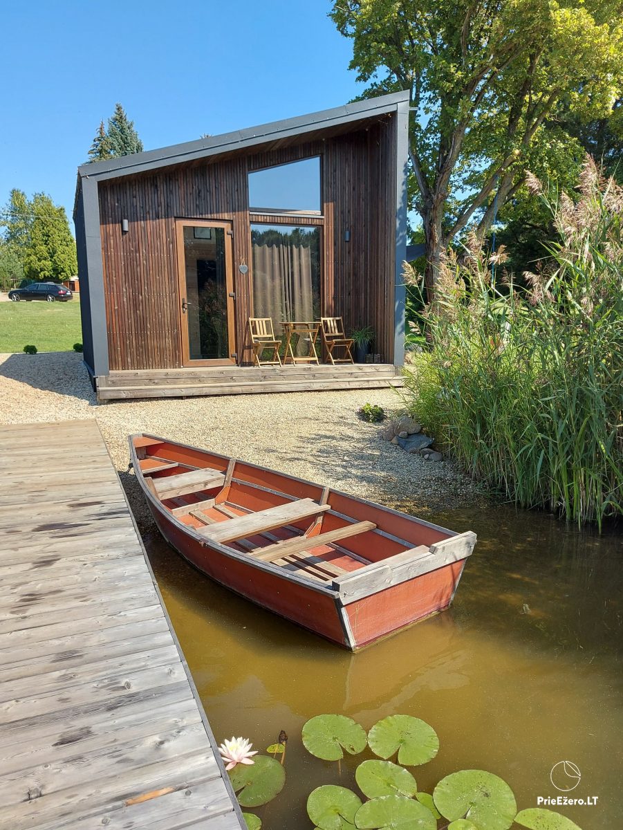 Jauna mini māja ezera krastā, privāts mols, laiva.