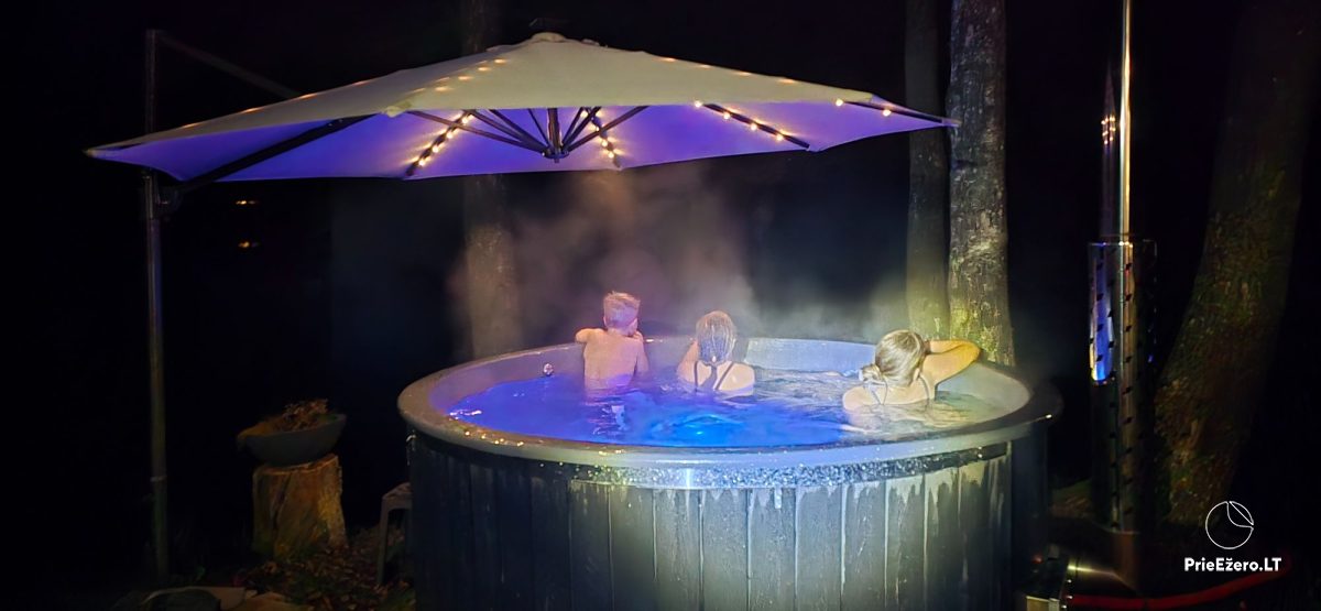 Vēl labākai atpūtai piedāvājam iznomāt XL džakuzi vannu, kas uzstādīta ezera krastā ar 7 krāsu LED apgaismojumu. Nomas cena - 80 eur līdz 4 stundām. Pirts - sauna / 30 eur. Pirts + vanna par 100 eur līdz 4 stundām.