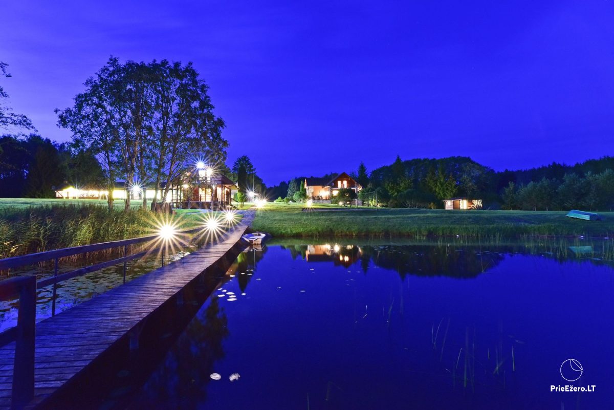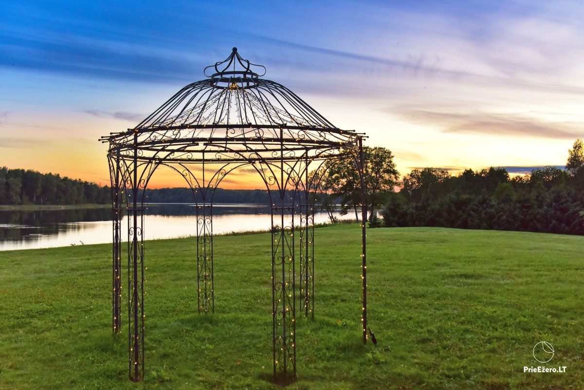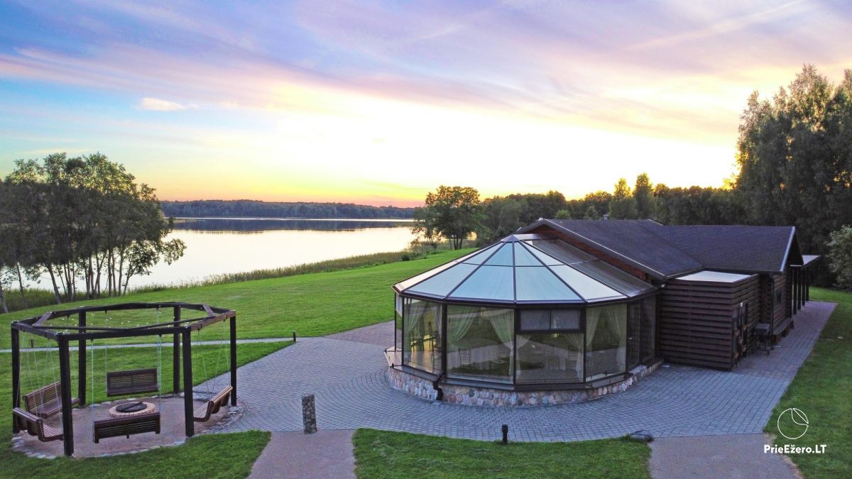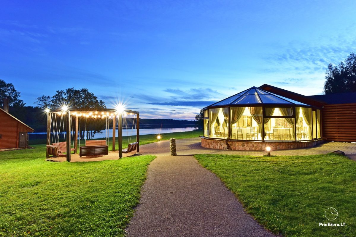 Jūsų šventėms – išskirtinio dizaino pokylių salės su ežero vaizdu, net 4,5 ha teritorija ant ežero kranto, aplink kelių šimtų metrų spinduliu nėra kaimynų.