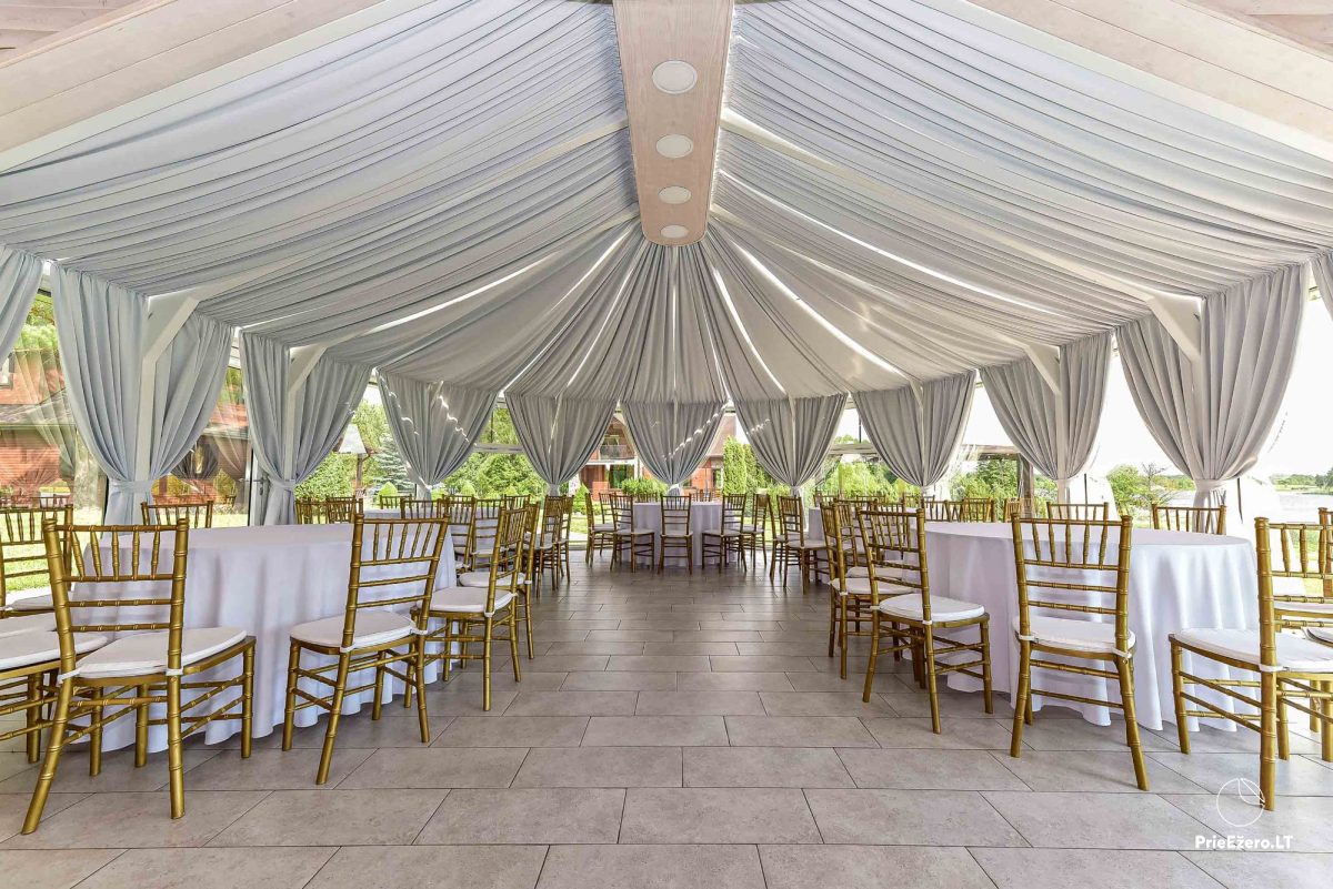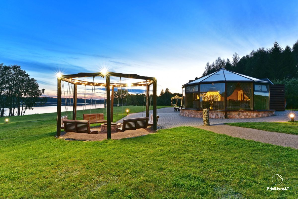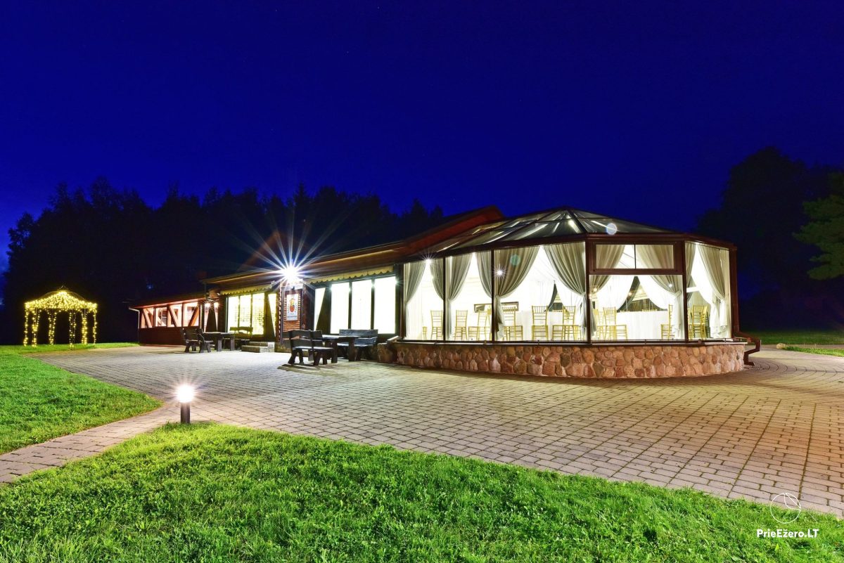 Jūsų šventėms – išskirtinio dizaino pokylių salės su ežero vaizdu, net 4,5 ha teritorija ant ežero kranto, aplink kelių šimtų metrų spinduliu nėra kaimynų.