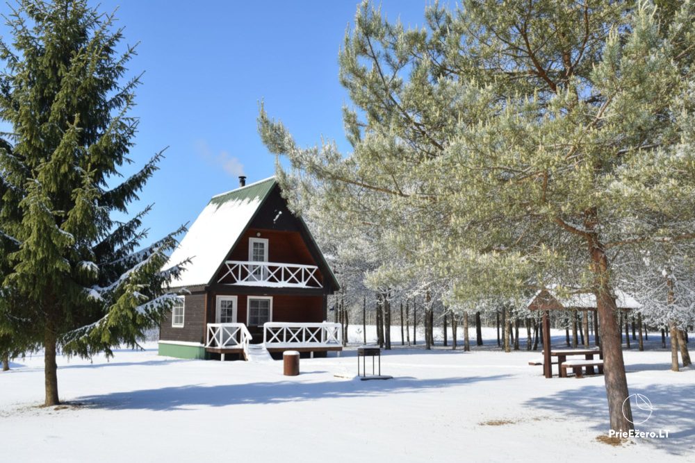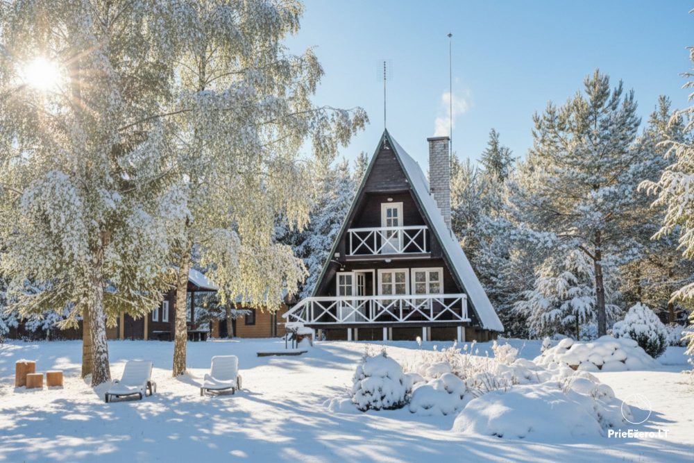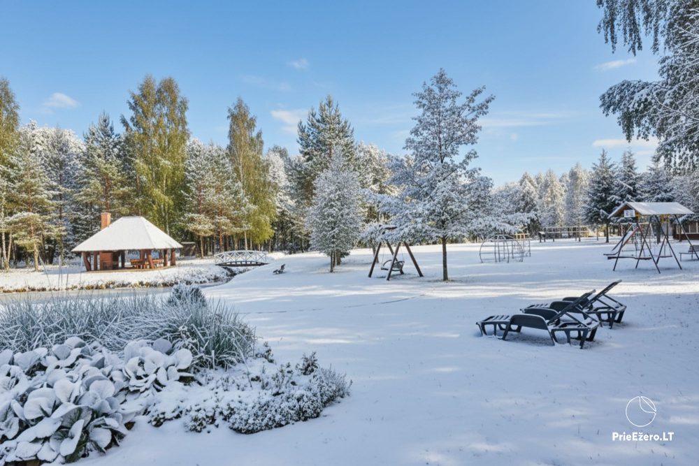 A banquet hall with a fireplace and TV, kitchenette with dishes, toilet, shower, sauna. On the second floor - 5 bedrooms with single beds: 3 triple rooms, 1 quadruple room and 1 room for 5 persons. The house is particularly suitable for seminars, birthdays, anniversaries, Christmas or New Year parties. The house is equipped with a separate pergola and grill, outdoor terrace. You can swim in a nearby water pond.