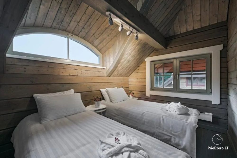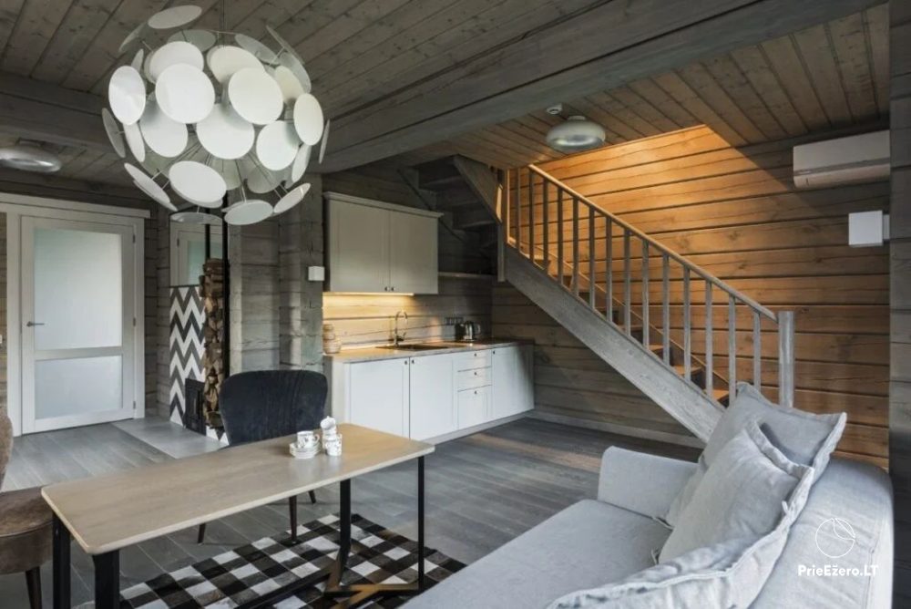 Katrā villā ir dzīvojamā istaba, neliela virtuve, četras guļamistabas otrajā stāvā un atsevišķa sauna.