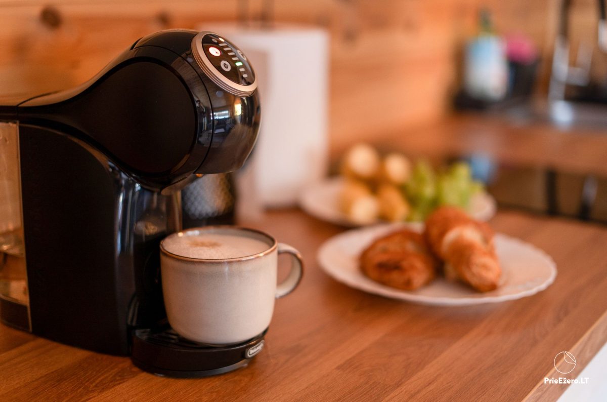 - Virtuve ar visiem piederumiem, plīti, ledusskapi, kafijas automātu, kafiju, tēju, cukuru, garšvielām, traukiem, trauku mazgāšanas līdzekļiem